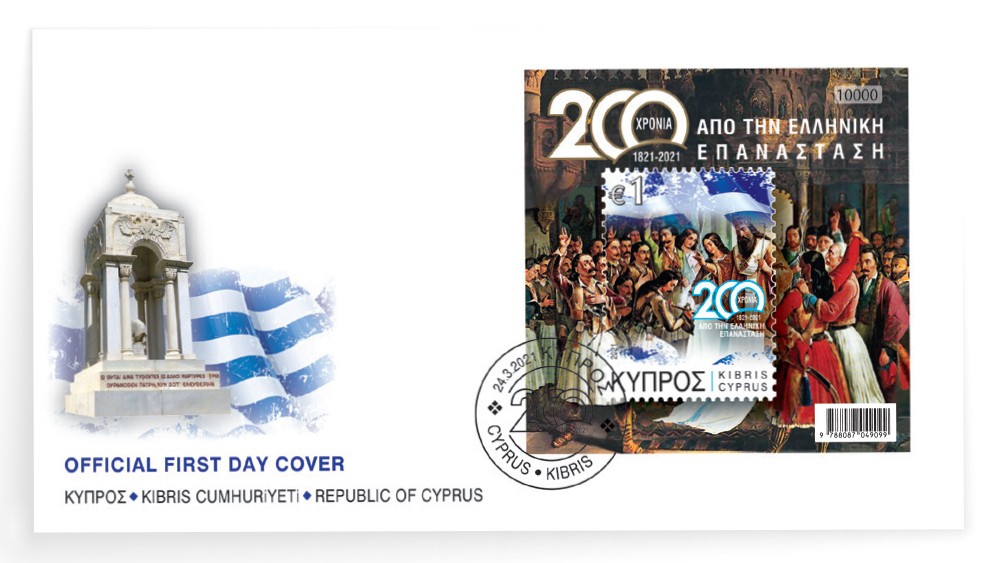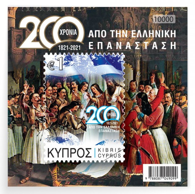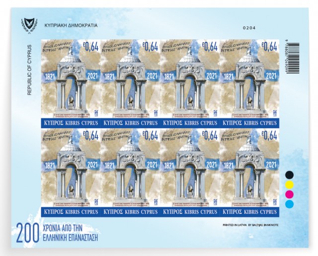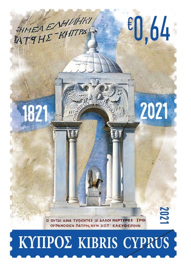 Στο γραμματόσημο των 64 σεντ απεικονίζεται μπροστά από την ελληνική σημαία των Κυπρίων Αγωνιστών του 1821, το Μαυσωλείο των Κυπρίων Μαρτύρων της 9ης Ιουλίου 1821, που βρίσκεται στο προαύλιο του ναού της Παναγίας Φανερωμένης στη Λευκωσία. Το Μαυσωλείο κατασκεύασε από πεντελικό μάρμαρο ο Αθηναίος γλύπτης Γ. Δημητριάδης το 1930 και έχει το σχήμα βυζαντινού κιβωρίου. Στον υπόγειο ταφικό θάλαμό του εναποτέθηκαν τα ιερά λείψανα του αρχιεπισκόπου Κύπρου (1810-1821) Κυπριανού, των μητροπολιτών Πάφου, Κυρηνείας, Κιτίου, καθώς και άλλων κληρικών