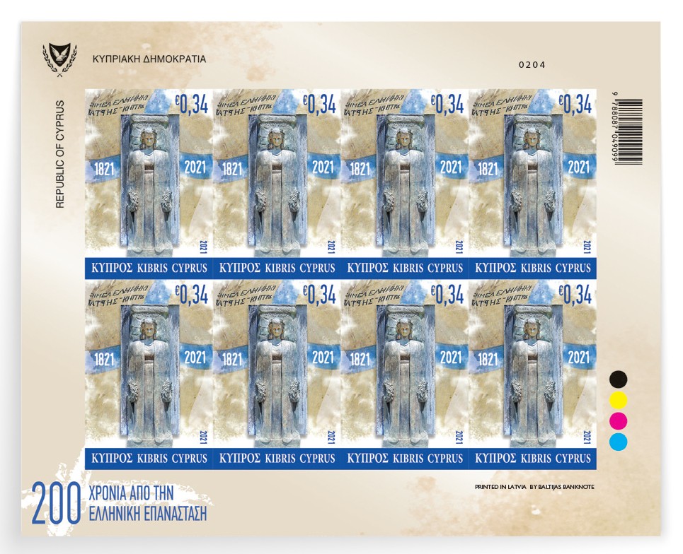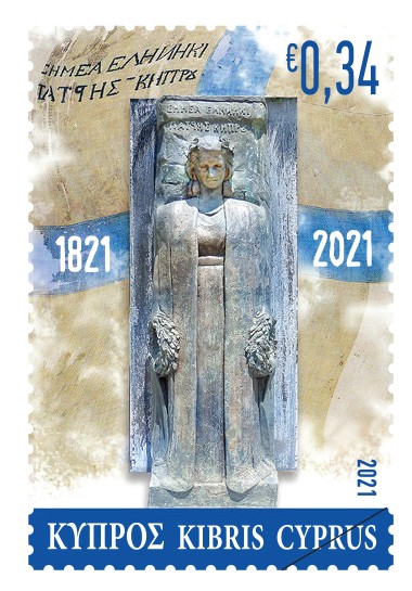 Στο γραμματόσημο των 34 σεντ απεικονίζεται μπροστά από την Ελληνική σημαία των Κυπρίων Αγωνιστών του 1821, το Μνημείο Κυπρίων Αγωνιστών, που βρίσκεται στον «Κήπο των Ηρώων» στο Μεσολόγγι. Το μνημείο ανεγέρθηκε το 2006 με δαπάνες της Κυπριακής Δημοκρατίας και είναι αφιερωμένο σε όλους τους Κυπρίους, οι οποίοι πολέμησαν κατά την Ελληνική Επανάσταση του 1821 και ειδικότερα κατά την Έξοδο του Μεσολογγίου τον Απρίλιο του 1826. Το μνημείο παριστάνει την Κύπρο ως μια γυναικεία μορφή να κρατά δύο δάφνινα στεφάνια.