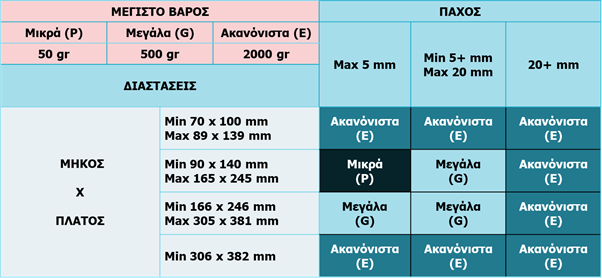 Η τιμολόγηση του Επιστολικού Ταχυδρομείου βασίζεται στην κατηγοριοποίηση των αντικειμένων σε Μικρά (P), Μεγάλα (G) και Ακανόνιστα (Ε) όπως περιγράφεται στον πιο κάτω πίνακα