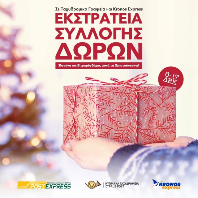Τα Κυπριακά Ταχυδρομεία, μέσα στα πλαίσια της κοινωνικής τους προσφοράς, θα προβούν στη συλλογή δώρων, τα οποία, σε συνεργασία με την εταιρεία KronosExpress, συνεργάτη στην παροχή της Υπηρεσίας PostExpress των Κυπριακών Ταχυδρομείων, θα διανεμηθούν στο Παιδοογκολογικό Θάλαμο του Μακάρειου Νοσοκομεί...