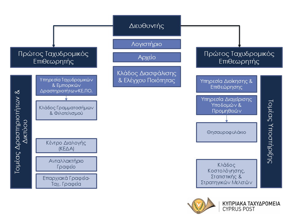 Από την 1η Σεπτεμβρίου 2025, στα πλαίσια αναδιοργάνωσης των Κεντρικών Γραφείων με στόχο την πιο ορθολογική λειτουργία τους και την προσαρμογή στις νέες συνθήκες, το οργανόγραμμα των Κυπριακών Ταχυδρομείων έχει αλλάξει.
