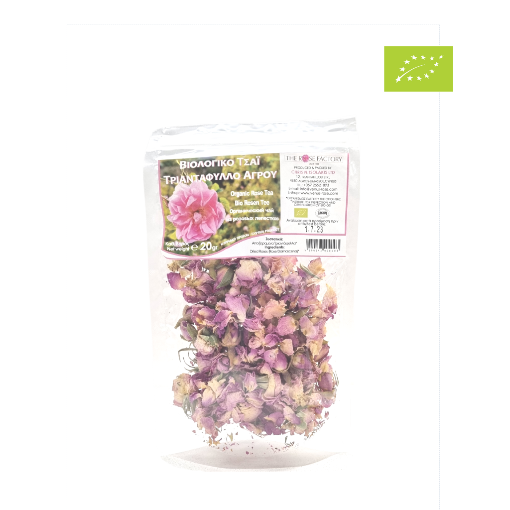Ένα γνήσιο, φυσικό τσάι πλούσιο σε βιταμίνη C, από τα βιολογικά καλλιεργημένα φυτά μας, συγκεντρώνει όλες τις μοναδικές ιδιότητες του αιθέριου ελαίου του τριανταφύλλου. Έχει αποδειχθεί επιστημονικά ότι έχει μια ήπια και αποτοξινωτική δράση. Βοηθάει, επίσης, την κυκλοφορία και την πέψη, ισχυροποιώντας έτσι το ανοσοποιητικό σύστημα του σώματος. Ιδιαίτερα χαλαρωτικό, συνιστάται για την ανακούφιση από τους πόνους της περιόδου. Καθώς διεγείρει την παραγωγή ενδορφινών στο σώμα, μπορεί επίσης να χρησιμοποιηθεί ως ένα ήπιο αντικαταθλιπτικό. Ένα έως δύο φλιτζάνια την ημέρα είναι αρκετά για να βοηθήσουν γαστρεντερικές δυσλειτουργίες και έτσι έμμεσα την ανακούφιση από την δυσκοιλιότητα. Δεν περιέχει συντηρητικά. Πιστοποιημένο βιολογικό από την LACON
