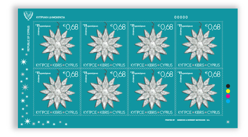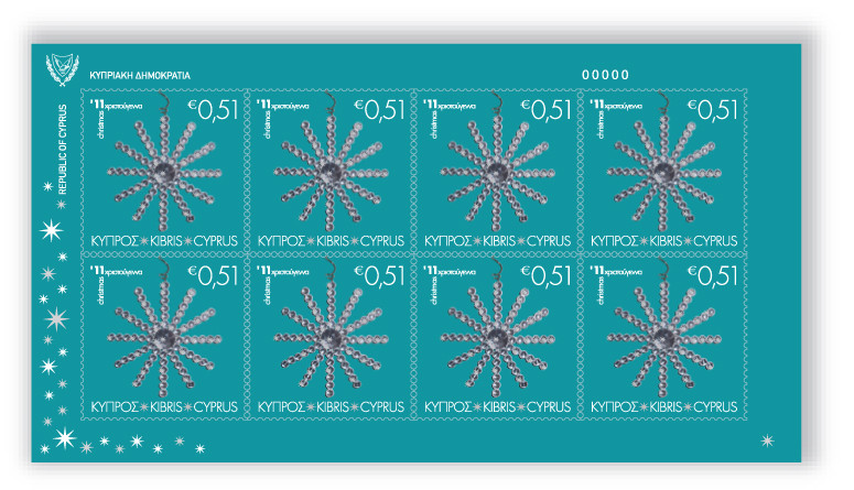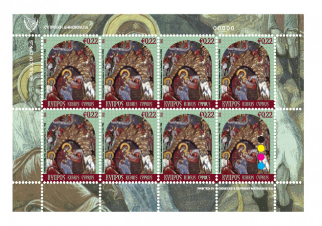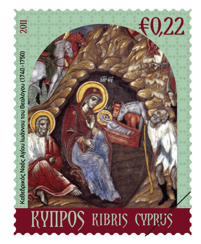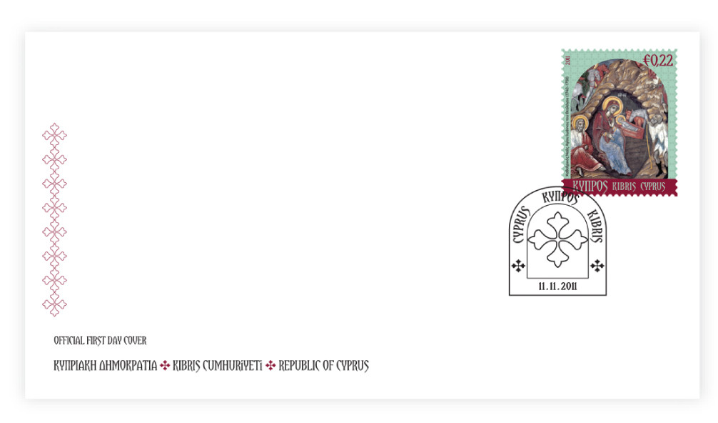 This year’s Christmas series consists of three stamps of 22, 51 and 68 cent. The 22 cent stamp, depicts a detail from a mural of the Birth of Christ (1740-1750) from the Cathedral Church of Agios Ioannis. The 51 cent and 68 cent stamps depict the celebratory, joyous message of Christmas, that is traditionally represented on Christmas decorations.
