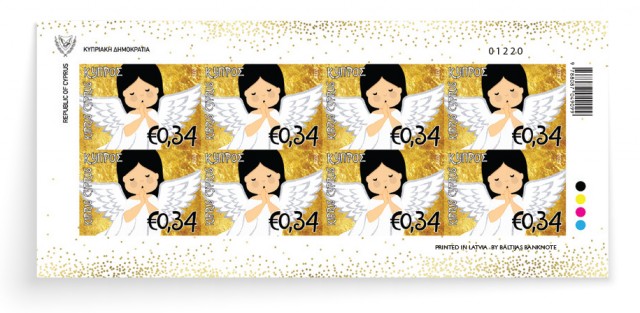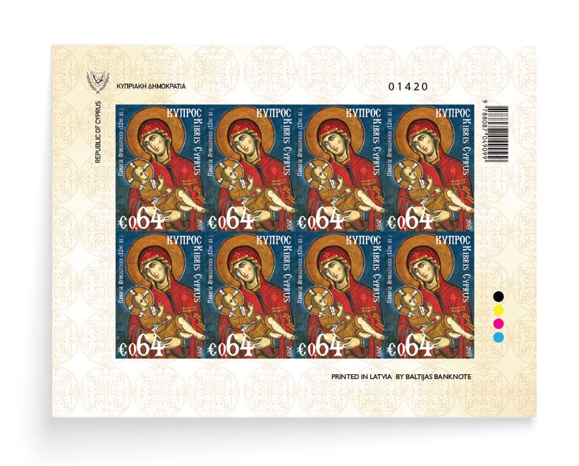 The €0.64 cent stamp illustrates the mural painting of the worshipping Panagia Arakiotissa and Kecharitomeni (Our Lady of Araka full of Grace) from the Church of Araka in Lagoudera dating back to 1192. This masterpiece of Arakiotissa is unique as to its content and symbolisms. The posture of Jesus leaning in his mother hands reminds us of the image of Christ-child as eucharistic symbol in Melismos. The characteristic eanring wom by the Jesus has been interpreted by a passage of the Exodus and with verses of the Old Τ estament in relation to the Passover sacrifice which is read in churches on the holiday of Candlemas.