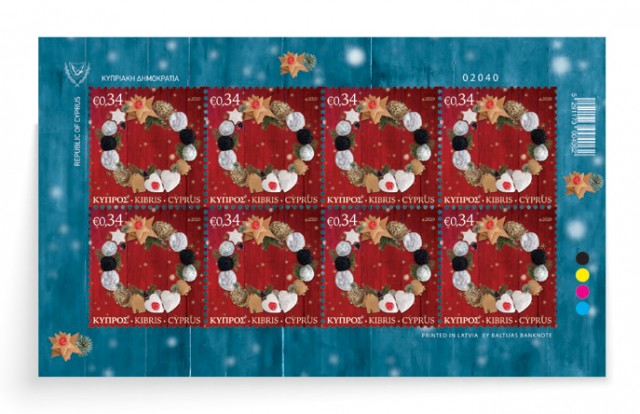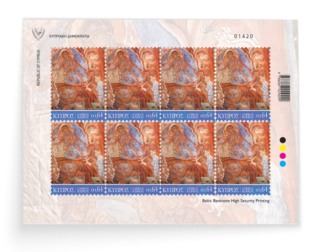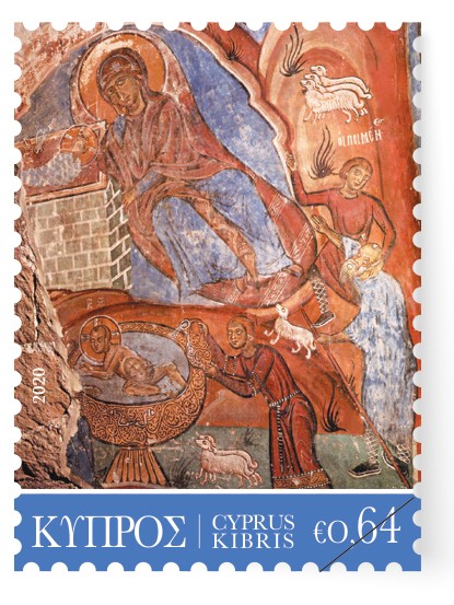 The €0.64 stamp illustrates the Nativity of Christ, from a fresco (end of the 12th century) in the Christos Antifonitis Church in Kalograia, which is an interpretation of the style of the Constantinople’s post-Comnenian art. At the opening of the cave, the Virgin Mary is depicted lying on a bed. On the left, in a built manger-sarcophagus, Christ is depicted swaddled. On the right are the Shepherds and below the bathing scene. After the Turkish invasion, the figure of the Virgin Mary was removed, irreparably destroying this unique composition.