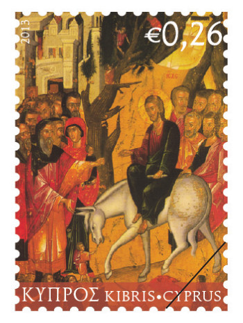 In the scene, Christ and his disciples are advancing from the right while a crowd is welcoming Christ at the gates of the city, with the rotunda of the Holy Sepulchre in the background.