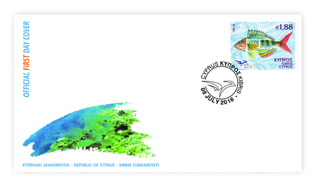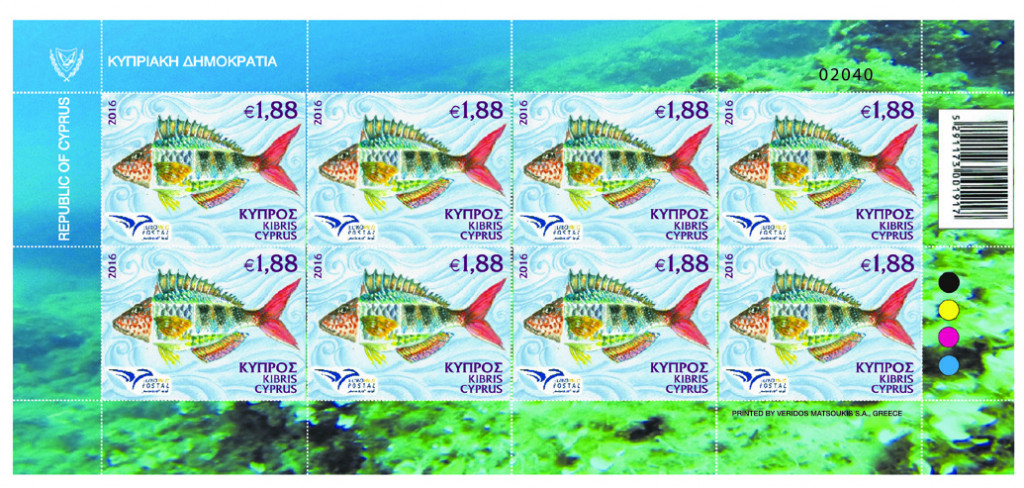 The €1,88 stamp depicts a montage of give species, namely: The Painted Comber, the Parrot Fish, the Peacock Wrasse, the Annular Sea Bream and the Snapper as symbols of the sea wealth.