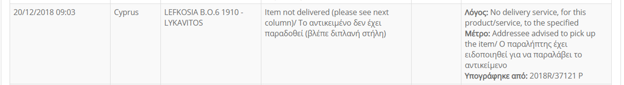 In case the item has not been delivered, the track and trace entry is "Item not delivered (please see next column)/Το αντικείμενο δεν έχει παραδοθεί (βλέπε διπλανή στήλη)", you should check the information in the relevant column which indicates the Reason for non delivery as well as the Measures taken.