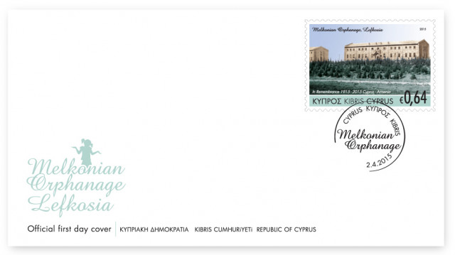 The image on the stamp is based on a photograph taken in the 1940’s by the late Haigaz Mangoian, a renowned photographer, himself a refugee, whilst the trees in the foreground were planted by the orphans in memory of their parents.